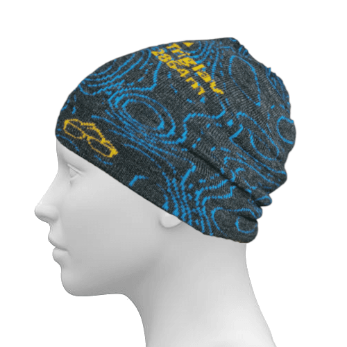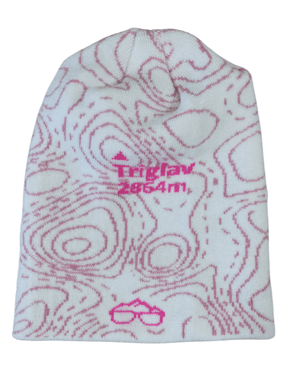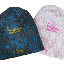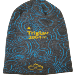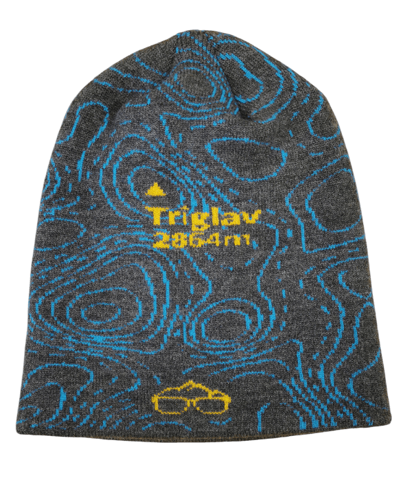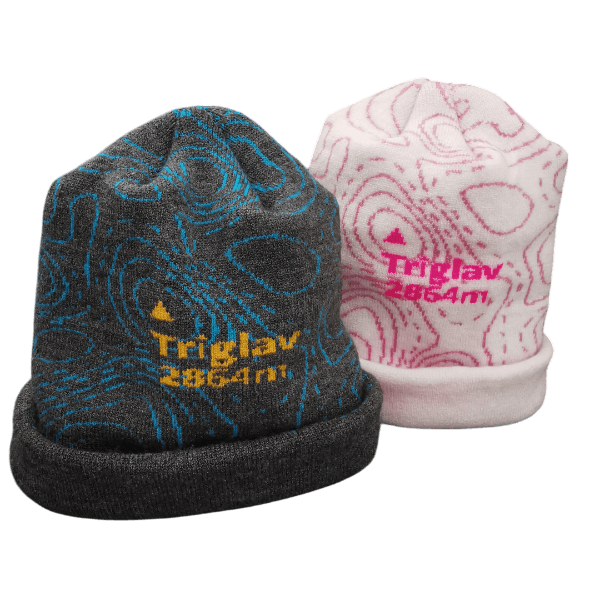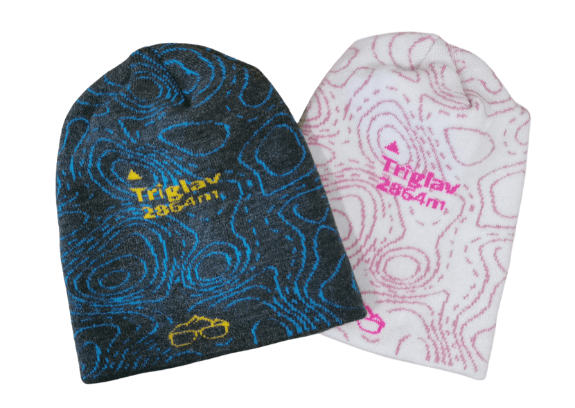 Zimska kapa, pletena iz dveh plasti, z motivom najvišje slovenske gore Triglav.