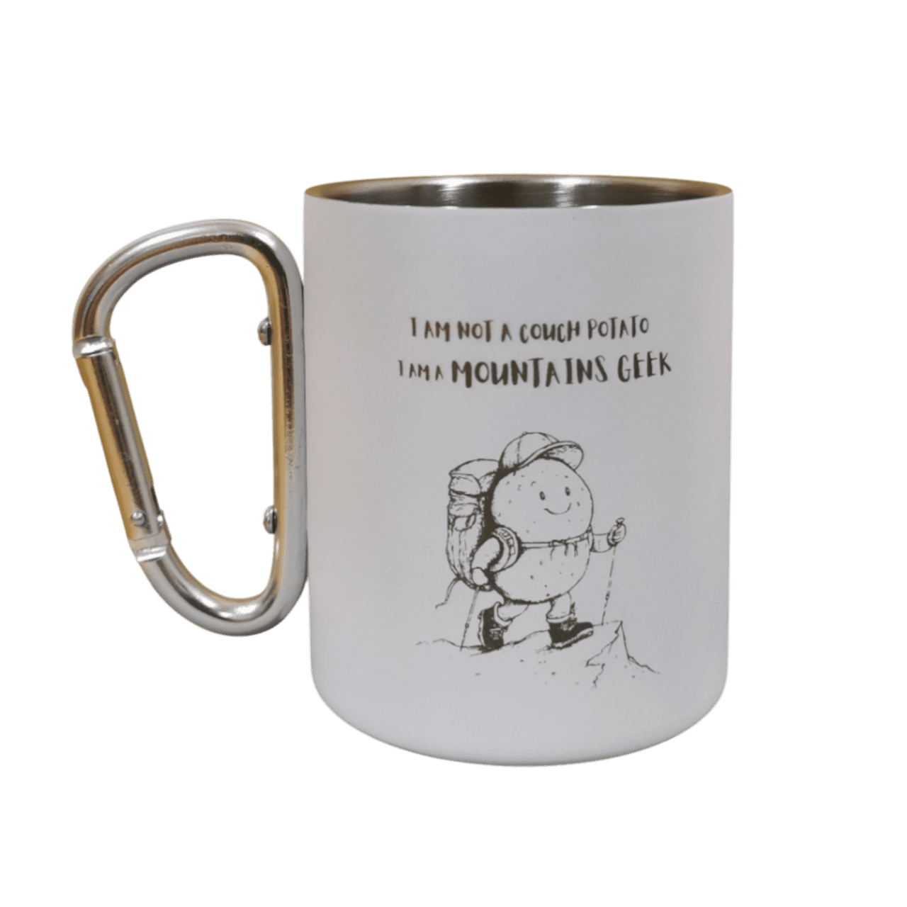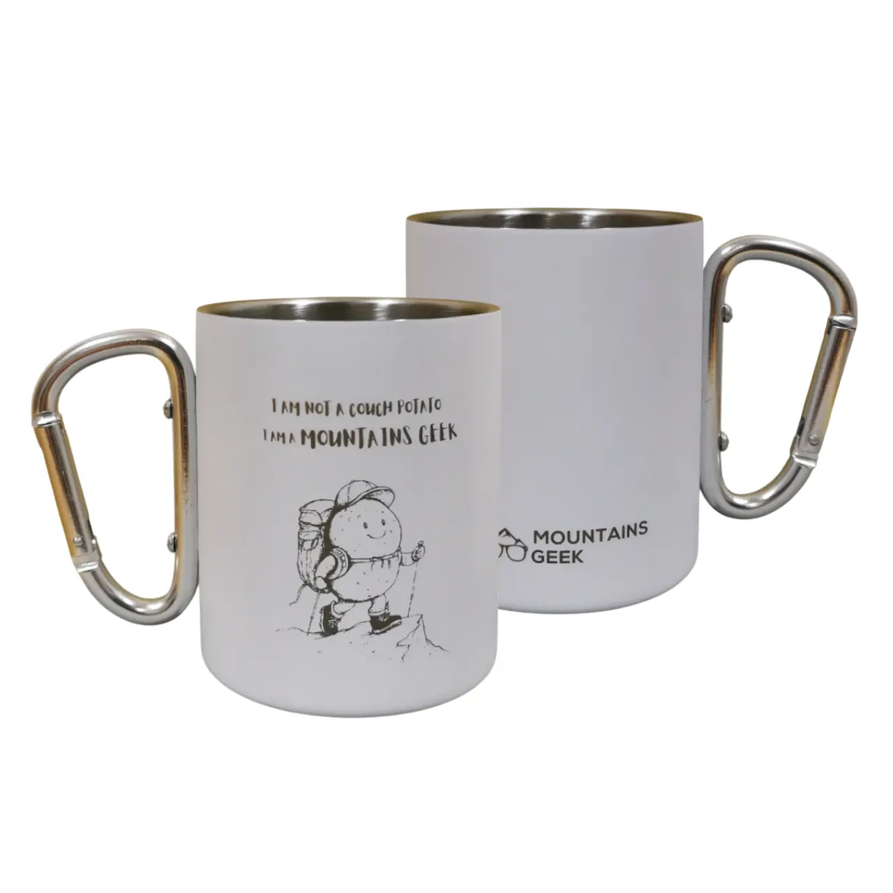 Skodelice so na voljo v štirih barvah: rdeči, modri, črni in beli, s simpatičnim potiskom “I am not a couch potato, I am a mountains geek,” ki izraža vašo strast do gora in aktivnega življenjskega sloga.