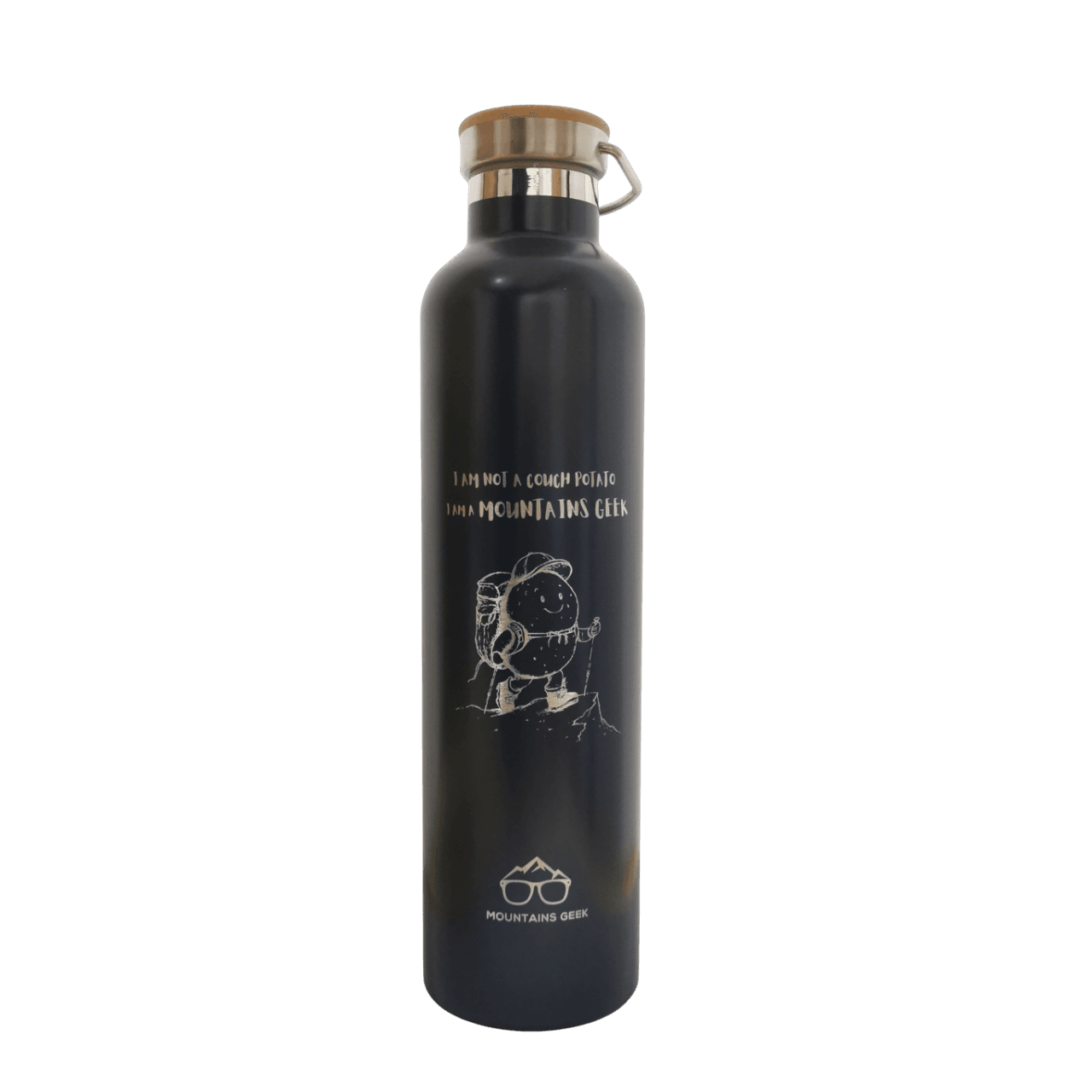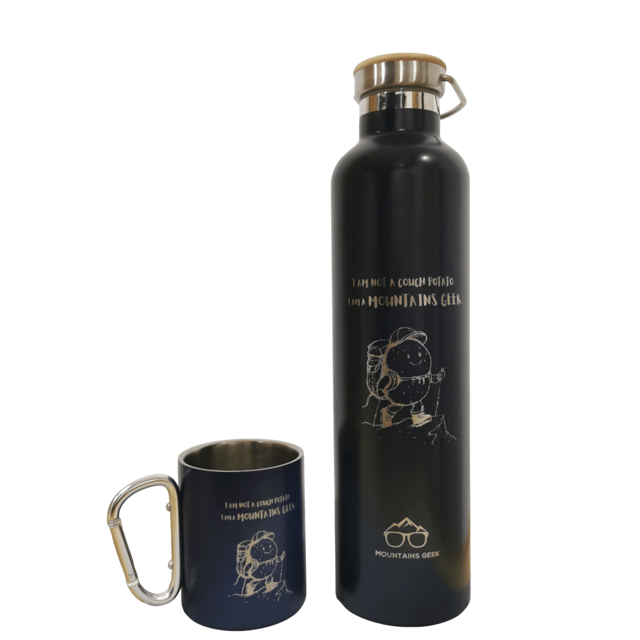 TERMO & LONČEK COUCH POTATO je idealen za vse navdušence nad pohodništvom in naravo. Vsebuje termo steklenico (1000 ml) iz nerjavečega jekla z bambusovim pokrovčkom, ki ohranja pijačo toplo ali hladno ves dan, ter kovinsko skodelico z napisom (300 ml) z dvojnima stenama in priročnim karabinom za enostavno pritrditev na nahrbtnik (možnost izbire od enega do štirih lončkov). Tako si lahko na vrhu hriba v skodelici privoščite kavo, čaj, kakav, … Oba izdelka krasijo zabaven motiv “I am not a couch potato, I am a mountains geek” in dizajn, ki odraža vašo ljubezen do gora.